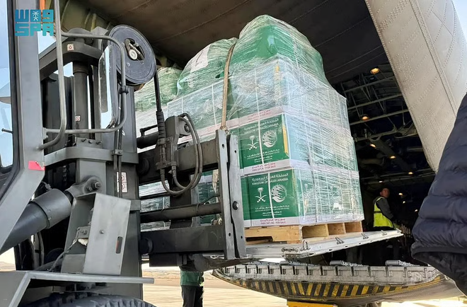 غزہ کے عوام کی امداد کے لیے سعودی عرب کی جانب سے بھیجا گیا 73 واں طیارہ مصر کے العریش ایئرپورٹ پہنچ گیا ہے۔ کنگ سلمان انسانی امدادی سینٹر کے تحت روانہ کیے گئے اس طیارے میں خوراک کے پیکج، رہائشی سامان اور برقی ویل چیئرز شامل ہیں۔
